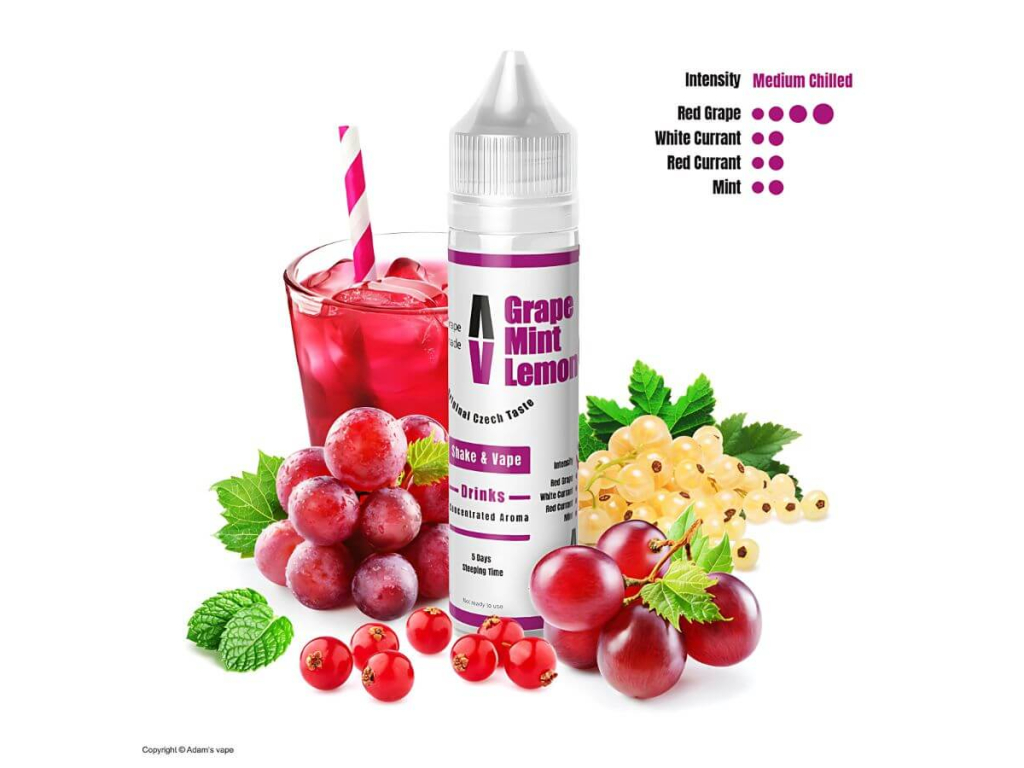 Adams Vape – Grape Mint Lemonade vás okouzlí pronikavou vůní hroznů s nádechem bobulového mixu. Chuť je komplexní a výrazná – nejprve ucítíte delikátní modré hrozny, které při výdechu doplní červený a bílý rybíz. Závěr je lehce mátově chladivý, s jemnou ovocnou kyselinkou a sladkostí. Hlavní důraz je kladen na dokonale vyváženou a lahodnou chuť, spíše než na chladivost.