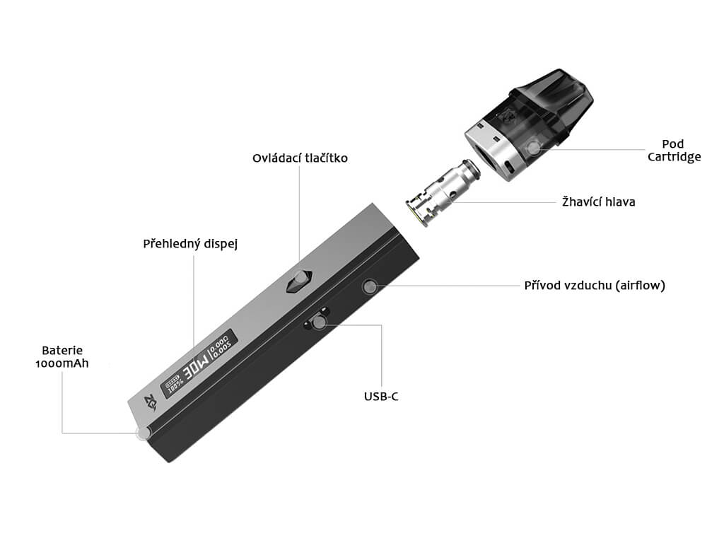 Tento model se pyšní velmi jednoduchým bočním plněním. Náplň lijete přímo do cartridge, kterou jednoduše otevřete, takže není třeba nic šroubovat ani odmontovávat.
